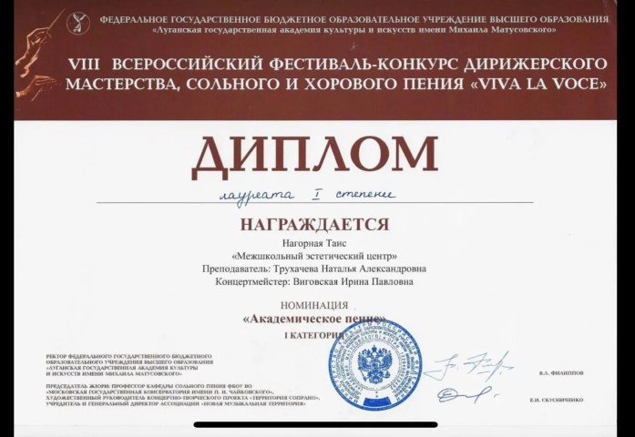 Поздравляем воспитанницу отделения академического вокала МЭЦ Нагорную Таис с заслуженным званием лауреата 1 степени VIII Всероссийского фестиваля «Viva la voce» (г.Луганск).