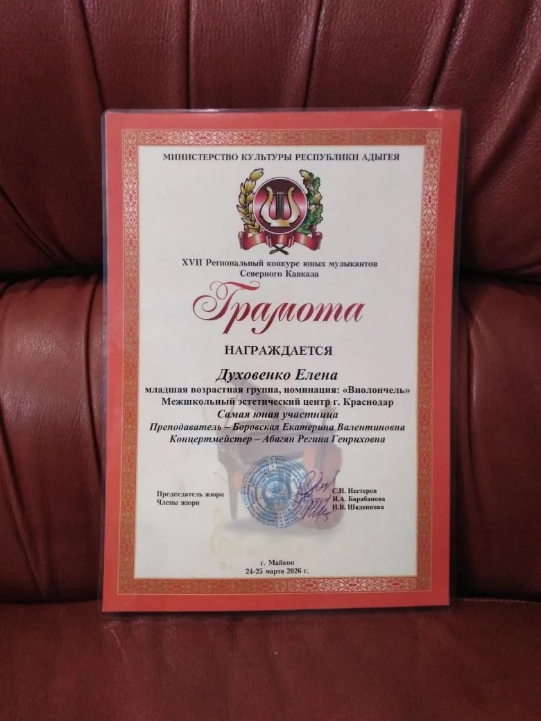 Духовенко Елена (виолончель, педагог Е.В. Боровская) — замечательно исполнила конкурсную программу и получила грамоту «Самая юная участница конкурса».