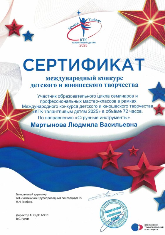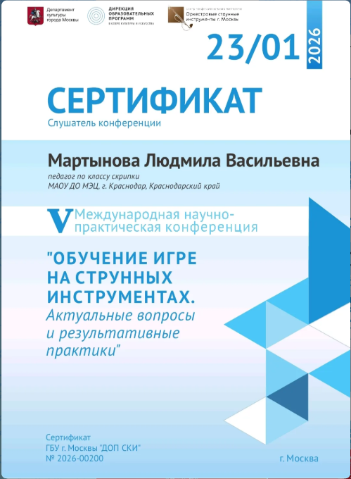 • Удостоверение о повышении квалификации ГБОУ "Дирекция образовательных программ в сфере культуры и искусства, тема: "Развитие исполнительского мастерства в классе струнных инструментов". 72 часа, ноябрь 2023г.