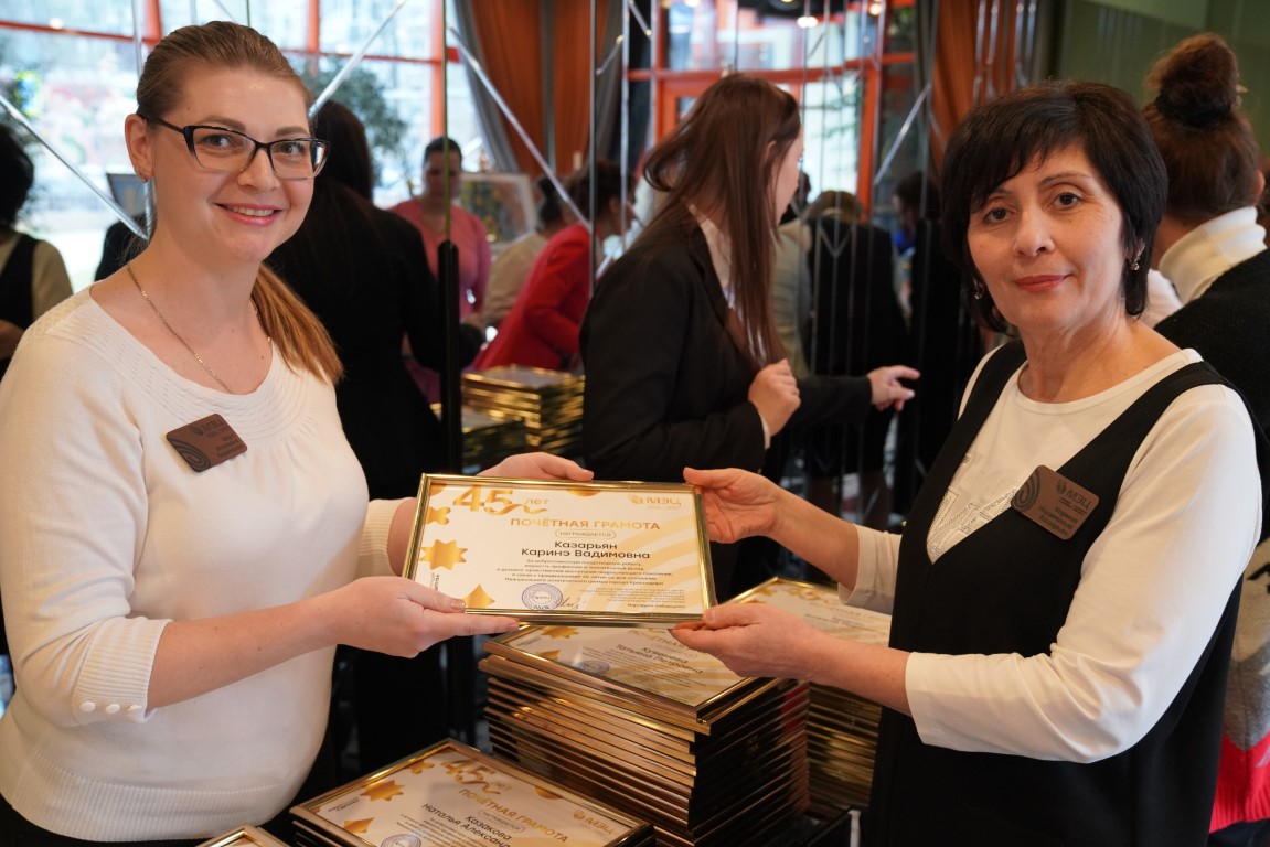 С поздравительным словом выступила директор Межшкольного эстетического центра Маргарита Араиновна Амбарцумян. В торжественной обстановке каждому сотруднику МЭЦ были вручены Почетные грамоты в честь 45-летнего юбилея центра, а прекрасным сотрудницам МЭЦ от профсоюза - памятные подарки.