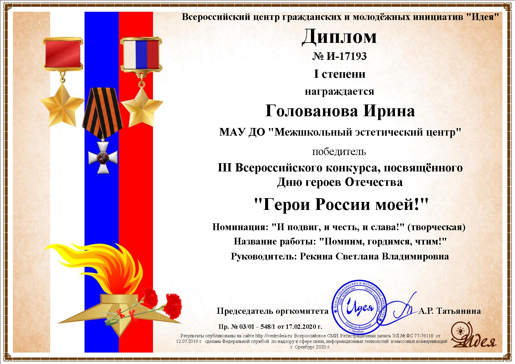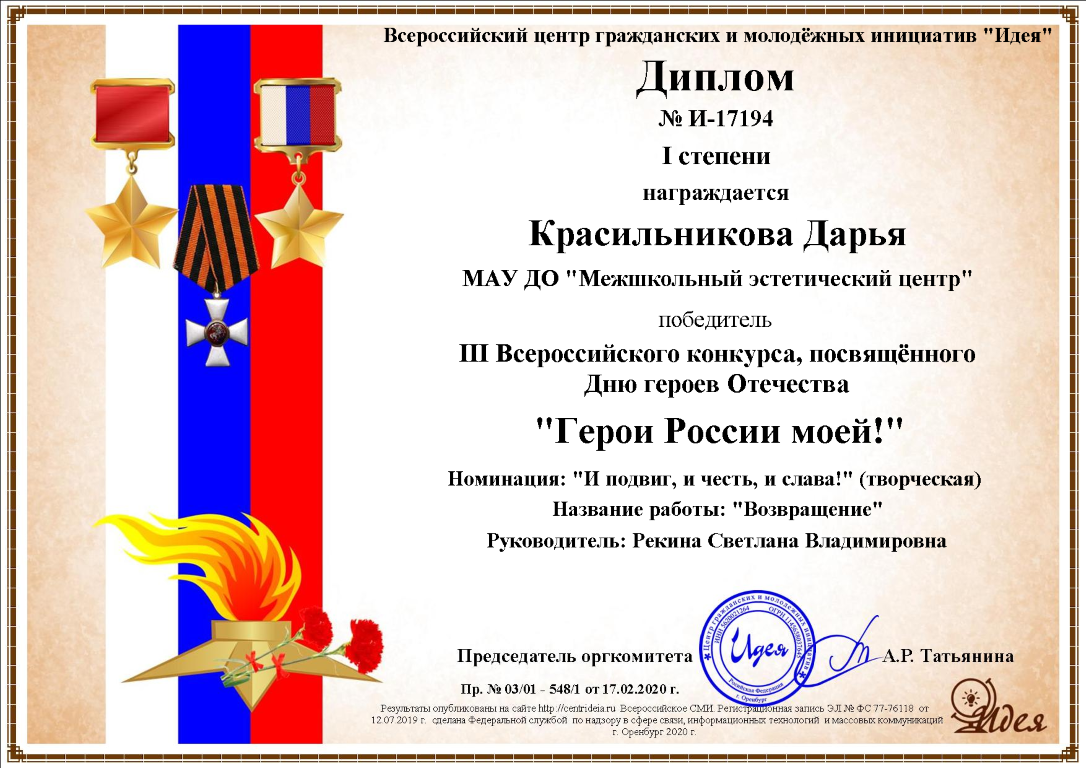 Всероссийский центр гражданских и молодежных инициатив «Идея» (г. Оренбург) подвел итоги III-го Всероссийского конкурса, посвященного Дню героев Отечества «Герои России моей!».