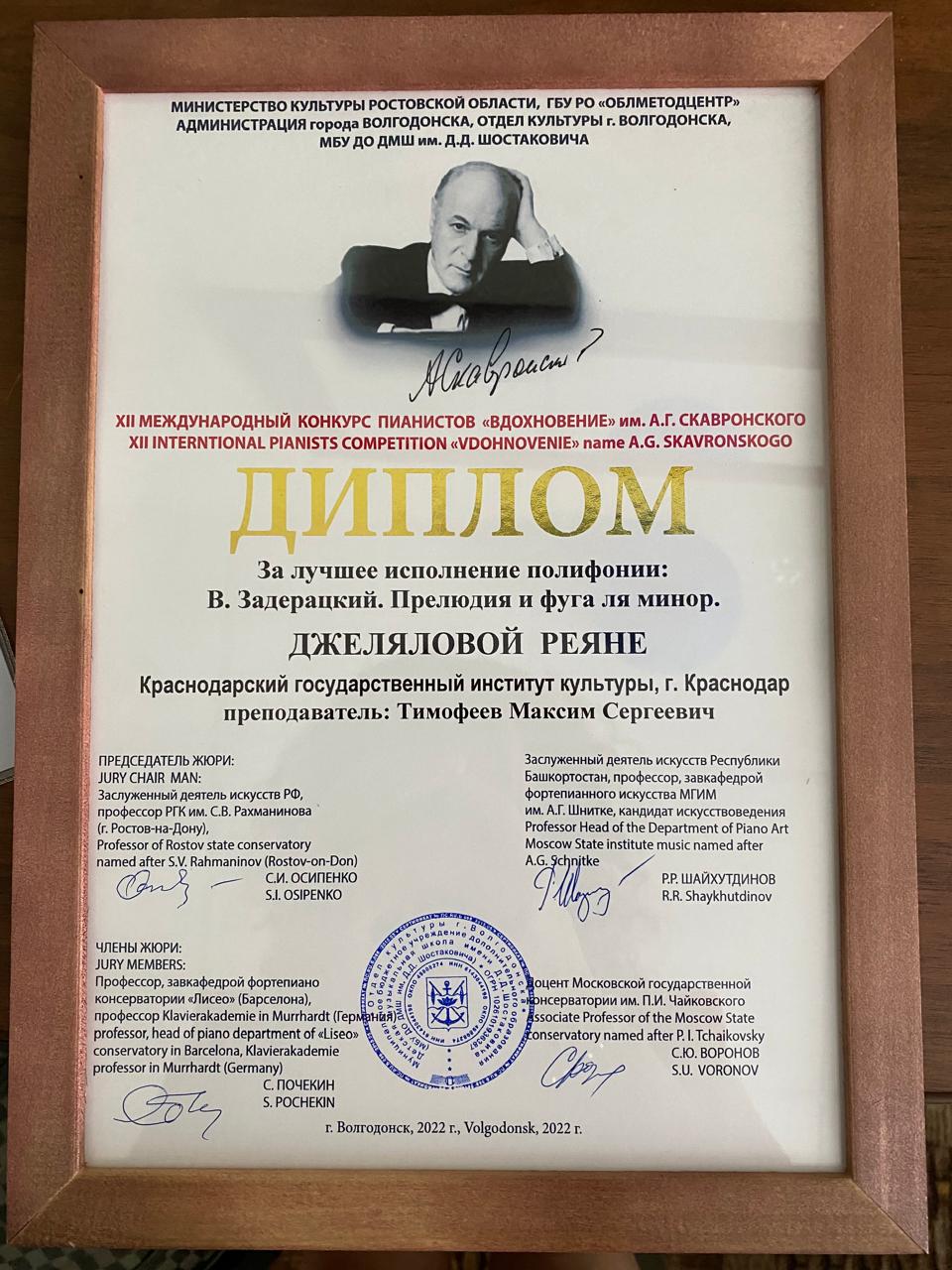 Уровень образование: высшее профессиональное (Ростовская государственная консерватория им. С. В. Рахманинова, 2021-2025)