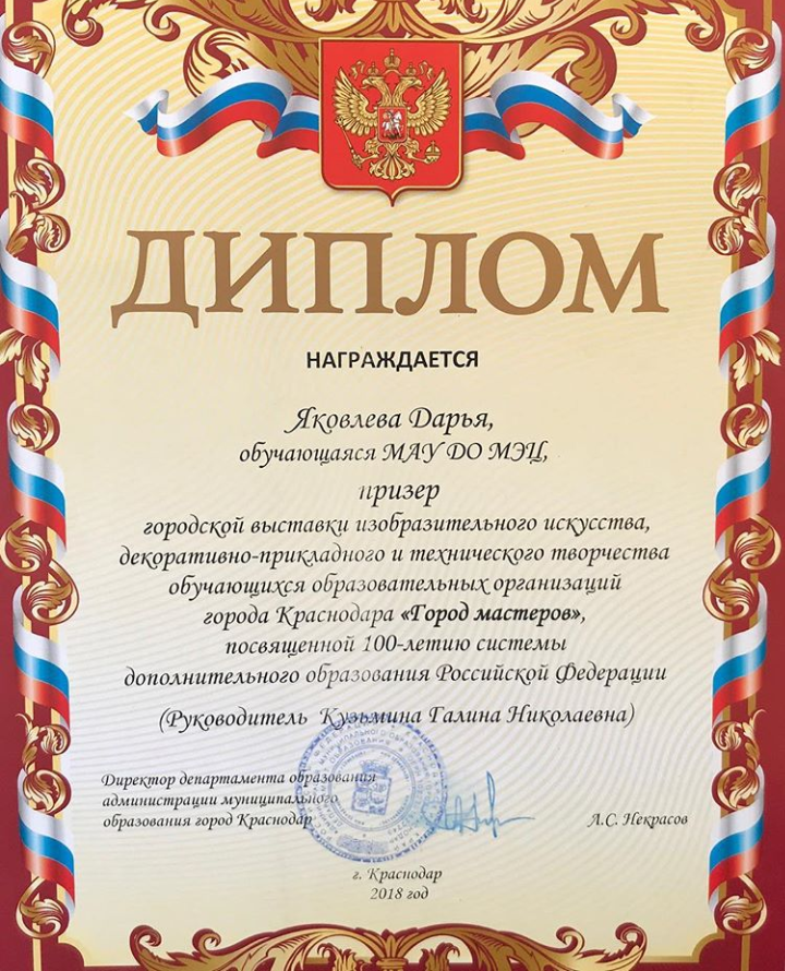 Награждена Почётной грамотой министерства РФ №271/н от 06 сентября 2021 г.
